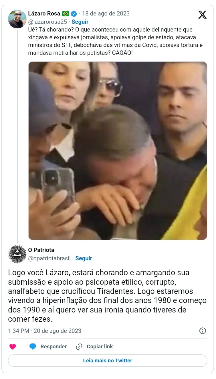 A ironia da esquerda lulopetista tornar-se-á choro e ranger de dentes em pouquíssimo tempo Ri, ri, tristíssimo palhaço! Leia aqui Compartilhe isso: Compartilhar no X(abre em nova janela) 18+ Compartilhar no Facebook(abre em nova janela) Facebook Curtir Carregando... Relacionado