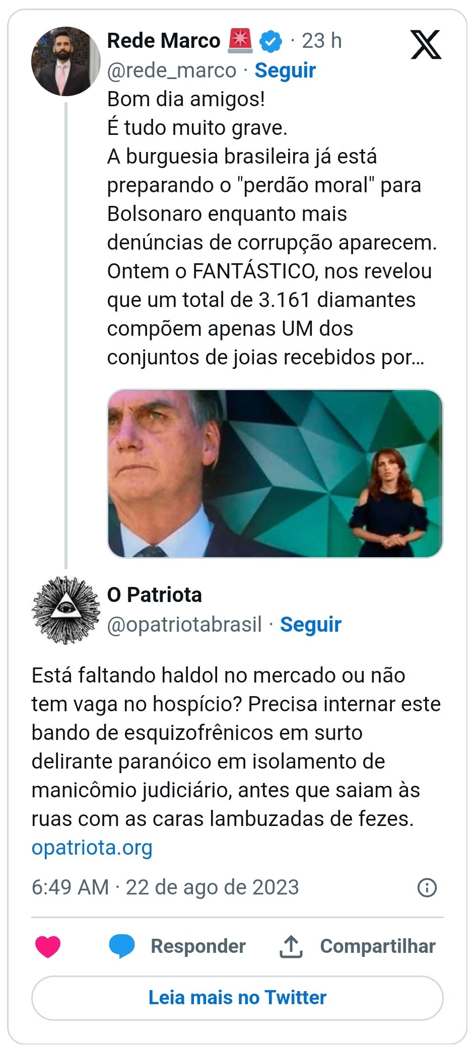 O desespero está provocando diarréia mental na esquerdalha Leia o twitte completo aqui Compartilhe isso: Compartilhar no X(abre em nova janela) 18+ Compartilhar no Facebook(abre em nova janela) Facebook Curtir Carregando... Relacionado
