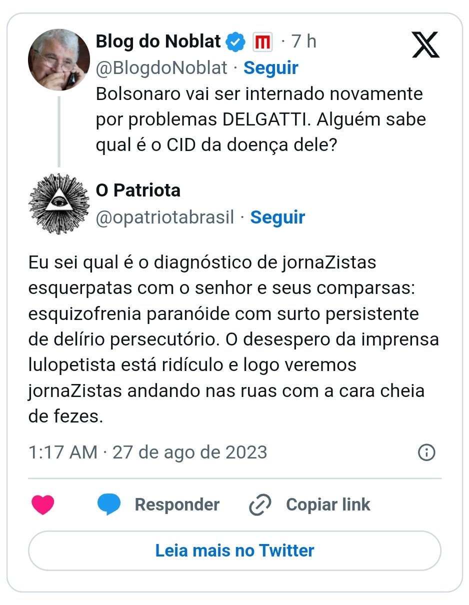 Noblat é tão “genial” e capacho que se cair de bruços come grama e carrega o lula montado em suas costas Leia aqui Compartilhe isso: Compartilhar no X(abre em nova janela) 18+ Compartilhar no Facebook(abre em nova janela) Facebook Curtir Carregando... Relacionado