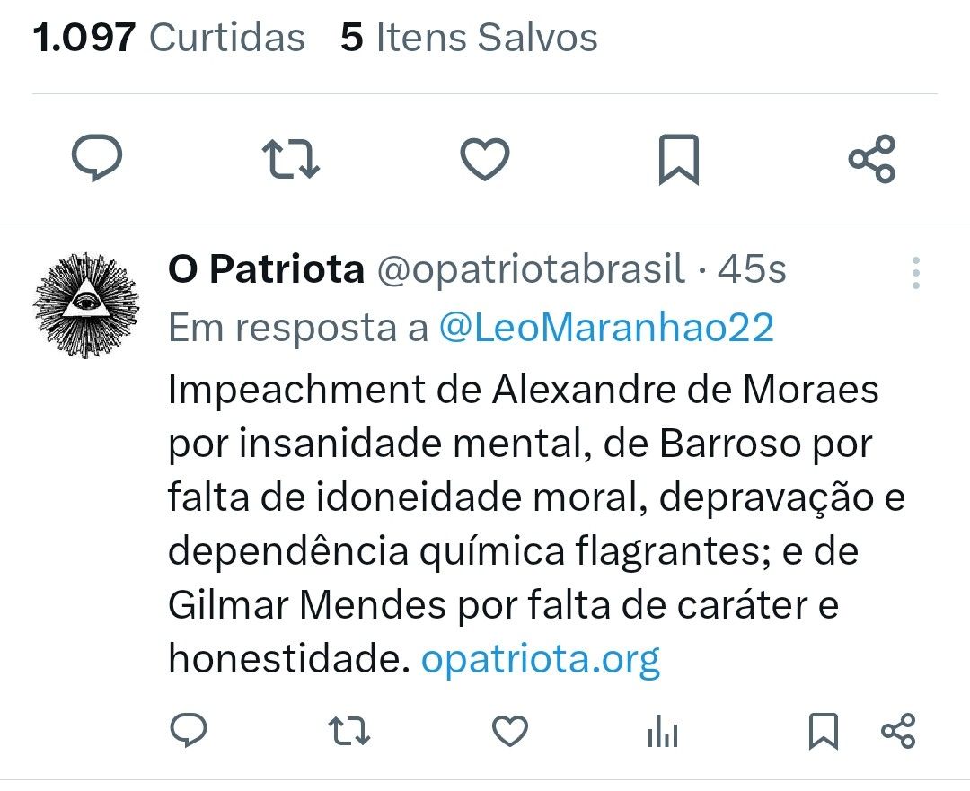 O impeachment urgente da banda podre da suprema casa de horrores e tolerância jurídica tupiniquim Compartilhe isso: Compartilhar no X(abre em nova janela) 18+ Compartilhar no Facebook(abre em nova janela) Facebook Curtir Carregando... Relacionado