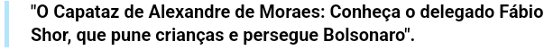 Será que o delegado Fábio Shor e seus capangas da gestapo alexandrina ainda não se deram conta de que o espetáculo de horrores do circo lulopetistE logo terá fim e eles certamente acabarão demitidos sumairamente por crime de responsabilidade e improbidade administrava e poderão terminar seus dias rastejando nas sarjetas, na melhor das hipóteses, ou encarceirados em isolamento de presídio de segurança máxima? Leia aqui