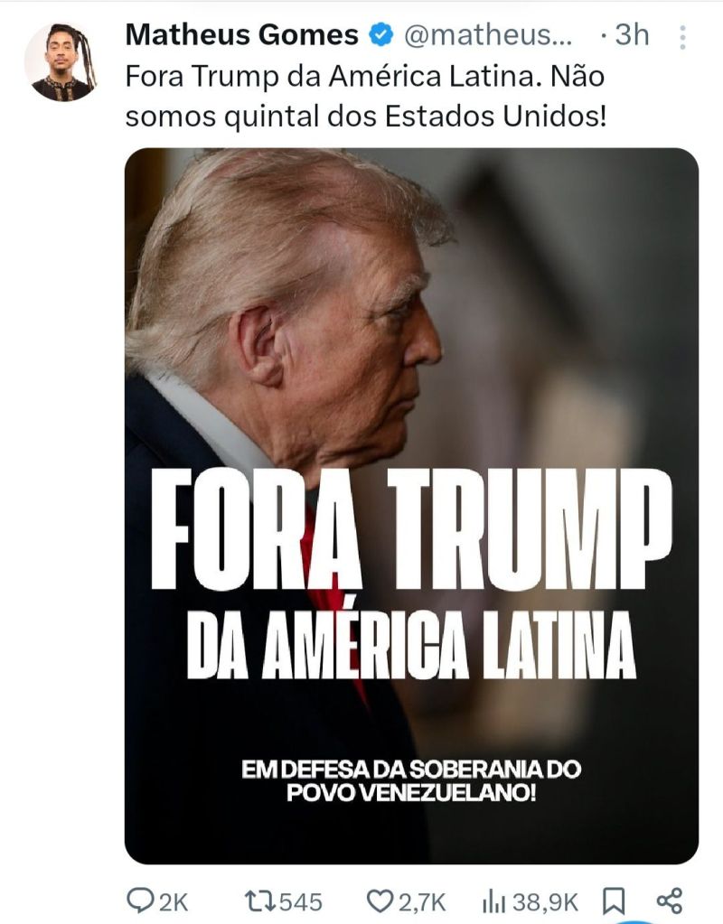 O Palácio da Alvorada está aceitando, de bom grato, doações de fardos de papel higiênico para limpar a diarréia descomunal que já deve ter acontecido o bêbado, corrupto e analfabeto que desgoverna o Bostil, após a prisão de seu comparsa, o narcoditador Maduro que, se abrir o bico, mandará luladrão apodrecer lá pelos lados de Guantánamo.